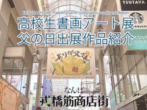 大阪の高校生のみなさんの書画作品を巨大バナーに拡大、商店街アーケードに展示する取り組みは5回目を迎えました。「父の日」には作品22点を応募いただきました。みなさんにたいへん感謝しています。