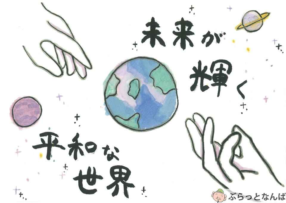 作品趣旨:世界が一つになることで、平和で輝く未来になってほしいという願いを込めて「未来が輝く平和な世界」という言葉を書きました。また、地球にのばしている手から世界がつながろうとしている様子を表現しました。色合いは寒色系で淡くしたことでこれから明るくなってほしいという意味を込めました。