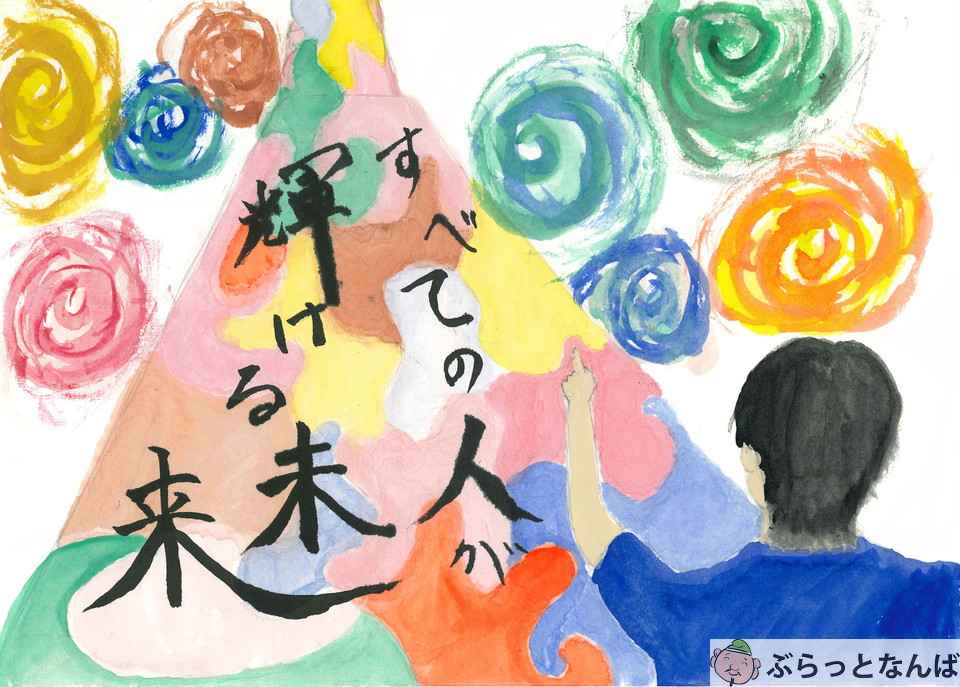 作品趣旨:初めに「すべての人が輝ける未来」というテーマを思いつき、十人十色という言葉もあるように、すべての人をたくさんの色で表現し、すべての人にとっての輝かしい未来を描きました。
