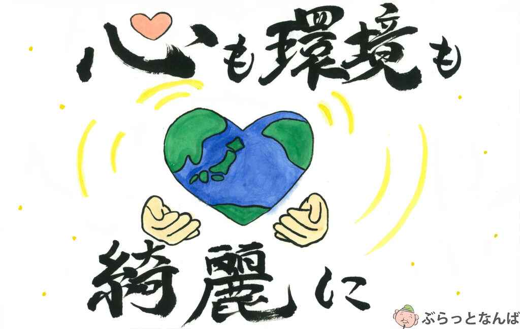 作品趣旨:現代社会において、日本だけに限らず、世界各国で様々な問題が起こっています。今回私が書いた「心も環境も綺麗に」という言葉には、「誰もが笑顔で幸せで、綺麗な心を持つ」、「環境も綺麗にして住みやすい地球に」という意味を込めました。