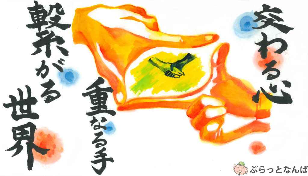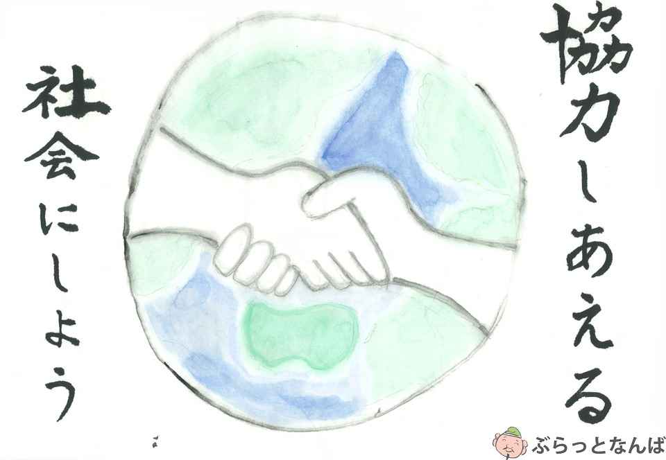 作品趣旨:もっとみんなが支え合い協力できる社会になればいいなという思いでかきました。手と手を取り合っていけるような社会を強く目指していくということを字の力強さで表現しました。