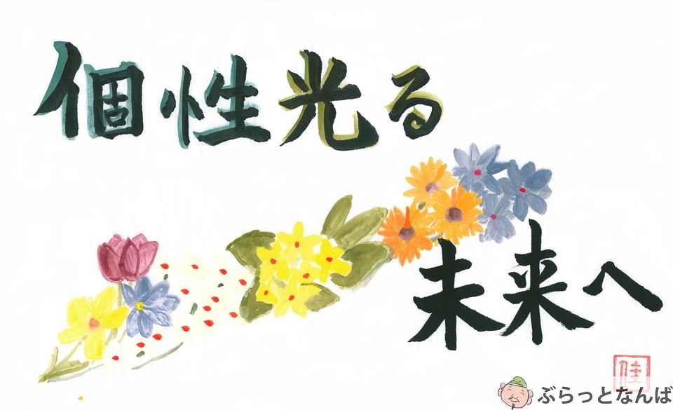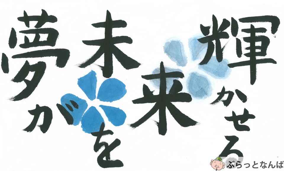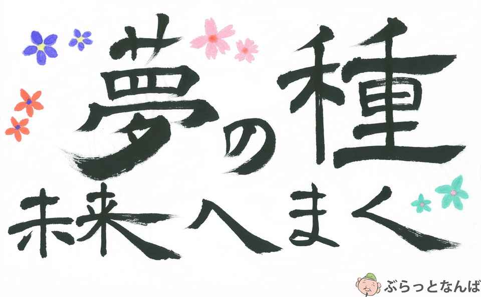 作品趣旨:様々な色や形の花を描くことで、1人1人違った夢を 持っているということを表現しました。 字もはらいの部分を大きく伸ばして書くことによって、 花が広がっていく様子を連想させるようにしました。 みんなの種が咲いていく姿を伝えたいです。