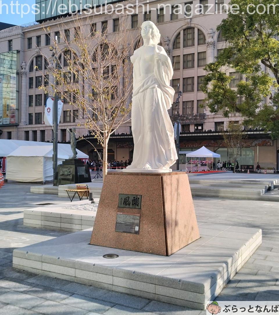 さらに2022(令和4)年から始まったなんば駅周辺道路空間再編工事により歩行者中心の広場として整備されたことに伴い、この像が生まれた経緯をふまえて広場と御堂筋の接点にあたる場所に御堂筋(北)に向かって再設置されました。
