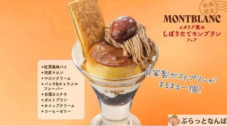 自家製ガストプリンがまるまる一個入った満足感の高いミニサンデー。コーヒーゼリー、ホイップクリーム、台湾カステラ、プリンの上にマロンクリームや渋皮マロン、紅茶風味パイがトッピングされています。