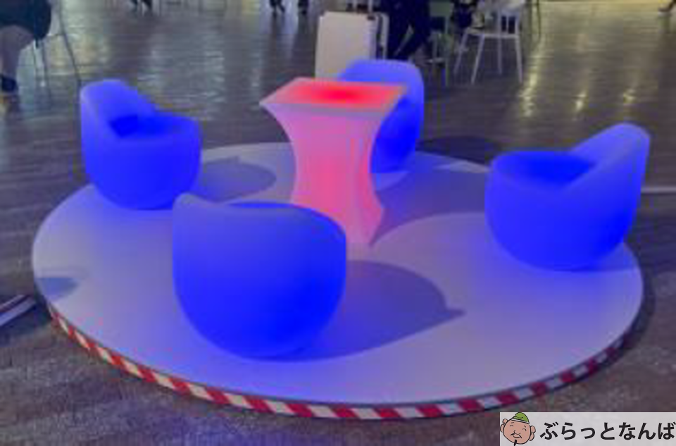 広場内の3カ所には、色や形もかわいい光るイスとテーブルも登場。ゆったり座りながら、にぎわう広場の様子を眺めるのもおすすめです。
