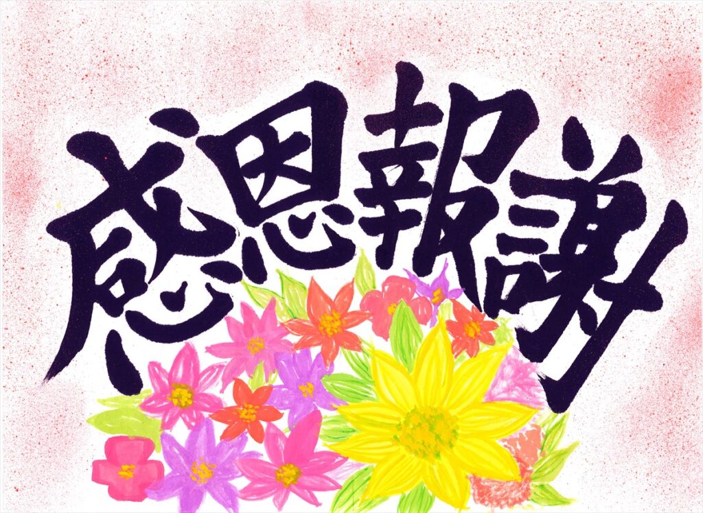 作品趣旨:おばあちゃんは花が好きなので、色とりどりの花とともに「感恩報謝」という感謝の気持ちを込めました。
