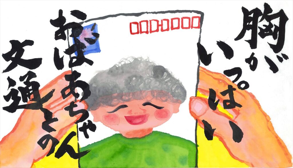 作品趣旨:毎月、何があったのか、おばあちゃんに絵はがきで報告をします。おばあちゃんからのお返事がきたときの嬉しい気持ちを作品にしました。