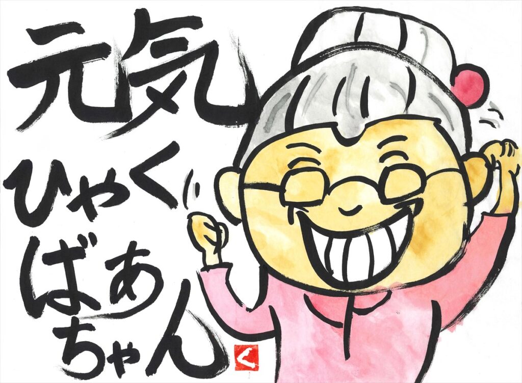 作品趣旨:「元気百倍」な「ばあちゃん」をイメージして、言葉を合体させました。大きな口で笑うばあちゃんのイラストを見てください。