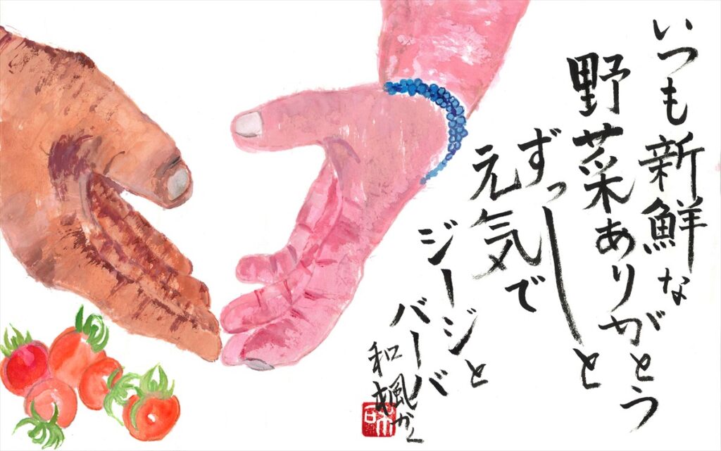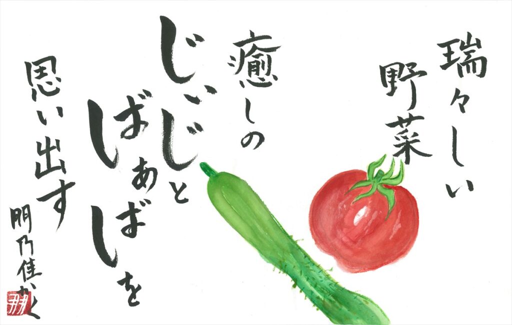 講評:仲良く手が 二つあって、 家庭菜園で採れた野菜とともに、祖父母の健康を願う気持ちがよく表れた作品です。