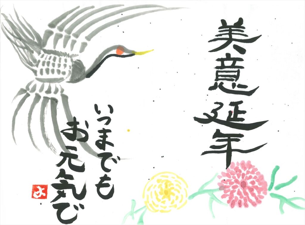 作品趣旨:長寿の象徴である鶴を描き、いつまでも長生きしてほしいという願いを込めて書きました。「美意延年」は、楽しいことを考えながら生きると自然と長生きできるという意味です。