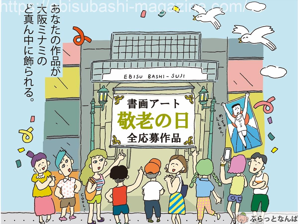大阪の若者のみなさんの書画作品を巨大バナーに拡大、商店街アーケードに展示する取り組みは7回目を迎えました。「敬老の日」には9つの高校から28作品を応募いただきました。力作ばかりで、みなさんにたいへん感謝しています。