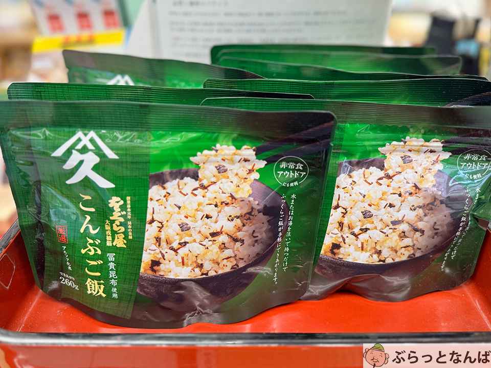 深緑のパッケージのこちらは、アウトドアや非常時にも使える「をぐら屋 こんぶご飯」。代表商品でもある国産昆布を細かく刻みショウガ風味に仕上げた「冨貴昆布」を使用し、アルファ化米にお湯を注ぐだけでふっくらとしたこんぶご飯が楽しめるレトルトパウチ商品です。保存期間が5年と長いので、万が一のときに備えてストックしておきたい一品です。