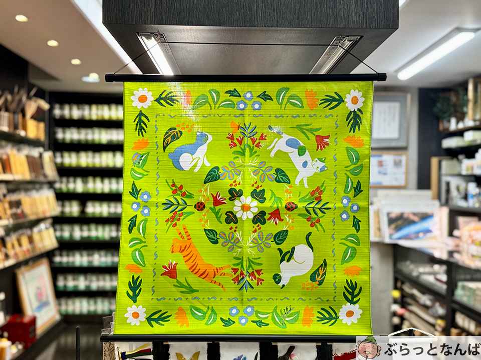 その中でも目を引くのが、鮮やかな緑色の小風呂敷。猫のイラストがかわいいこちらは、荷物を包むなど風呂敷として使うのはもちろん、飾り用のポールを使用すればタペストリーとして飾ることも可能です。手軽にお部屋のイメージチェンジができるので、いろんな柄を集めたくなりますね。