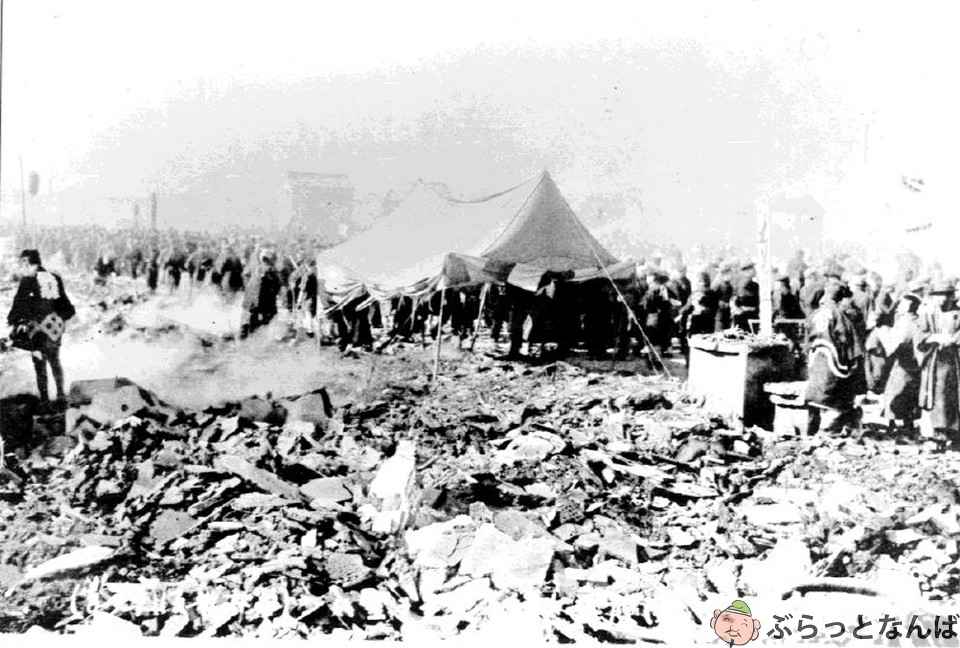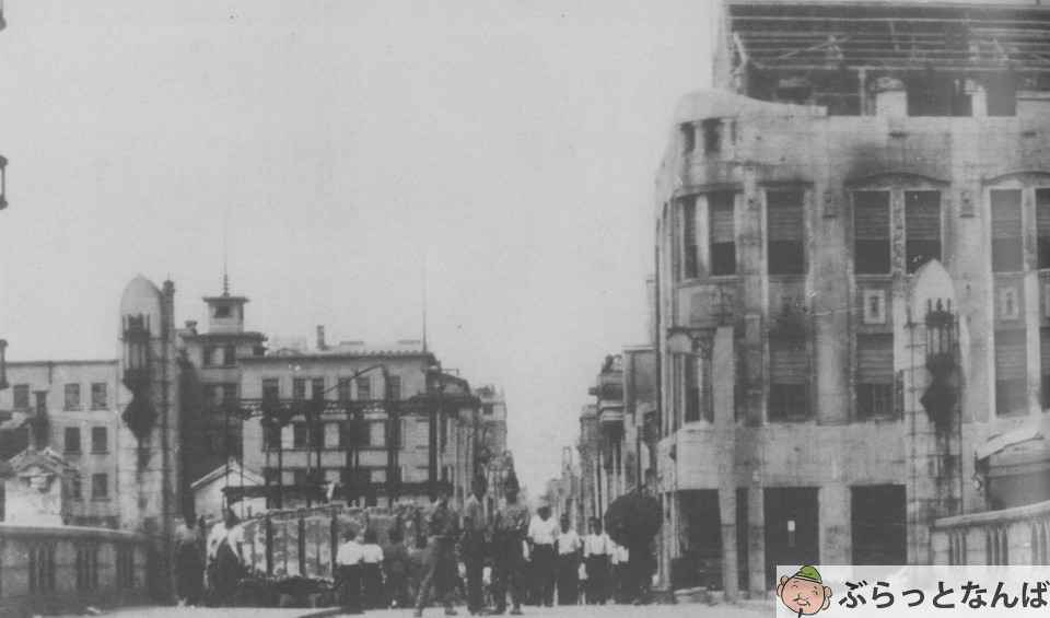 1945(昭和20)年3月13日夜から14日未明にかけての大阪大空襲では、南区一帯、現在の中央区全域が火の海に包まれたと記されています。戎橋筋商店街を含むなんばの街は、南海ビルや大阪松竹座など一部の建物を残すのみで、ほとんどが焼け野原となりました。