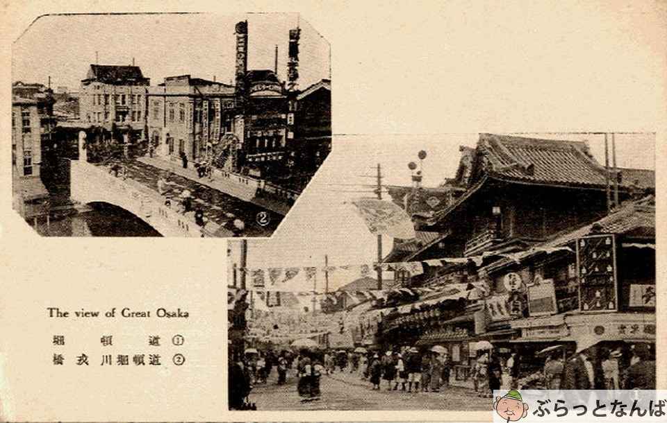 1925(大正14)年には、戎橋が石・コンクリート橋へと架け替えられます。周辺一帯は興行街としても大きく広がっていきます。浪花座・中座・角座・朝日座・辨天座の「五座」に加え、松竹座、さらに千日前周辺の演芸場や映画館が集まり、難波から道頓堀にかけては、日本を代表する娯楽の中心地として賑わいを見せました。