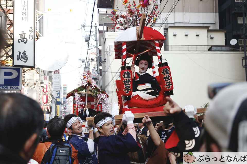 こうして、戎橋を渡って南北に行き交う人の流れが生まれました。花街の芸妓が駕籠を仕立てて今宮戎へ参る宝恵かご行列も元禄期に始まり、今も続いています。戎橋筋は、十日戎の参詣道であると同時に、芝居街、花街、見世物の場を行き来する道筋として賑わいを増していきます。