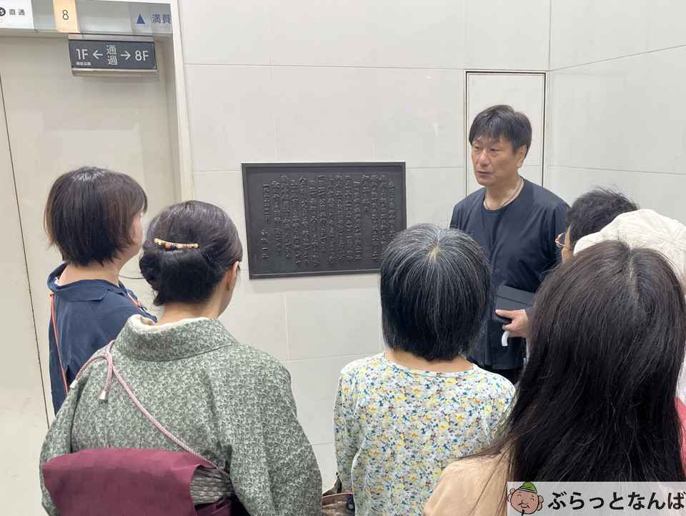 商店街の体験イベントで映画興行発祥の地の碑を紹介する様子