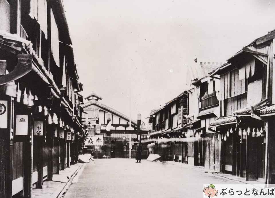 1911(明治45)年、この地域は大火災に見舞われます。現在の難波四丁目付近から出火し、折からの強い西風にあおられて、堺筋を越え、高津・生玉まで焼き尽くしたとされます。これをきっかけに、延焼防止のため千日前通は、およそ22メートルへと拡幅され、戎橋筋は南北に分断されることとなります。