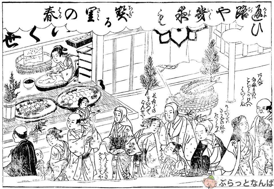 1730(享保15)年の『絵本御伽品鏡』には、戎橋を渡ろうとする男性が、吉兆を下げた福笹を肩に担ぐ姿が見えます。この絵は現在、戎橋南詰東側の欄干に設置された銘板の挿絵にも用いられています。