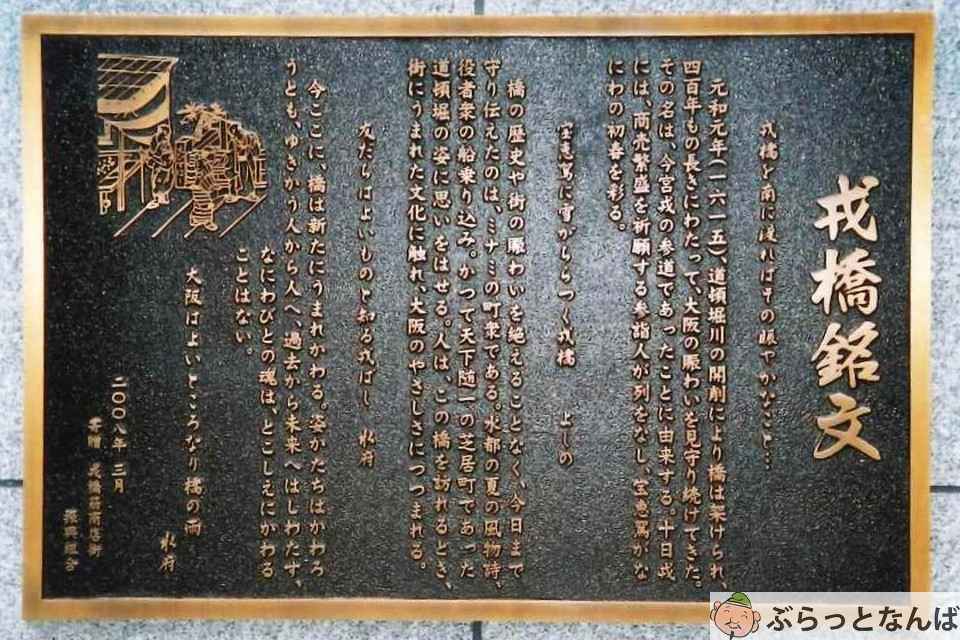 道頓堀川南側で芝居小屋と茶屋の営業が認められた1626(寛永3)年以後、道頓堀の町が一気に繁栄、戎橋は繁華街の開発にともなって架けられたものとみられます。
