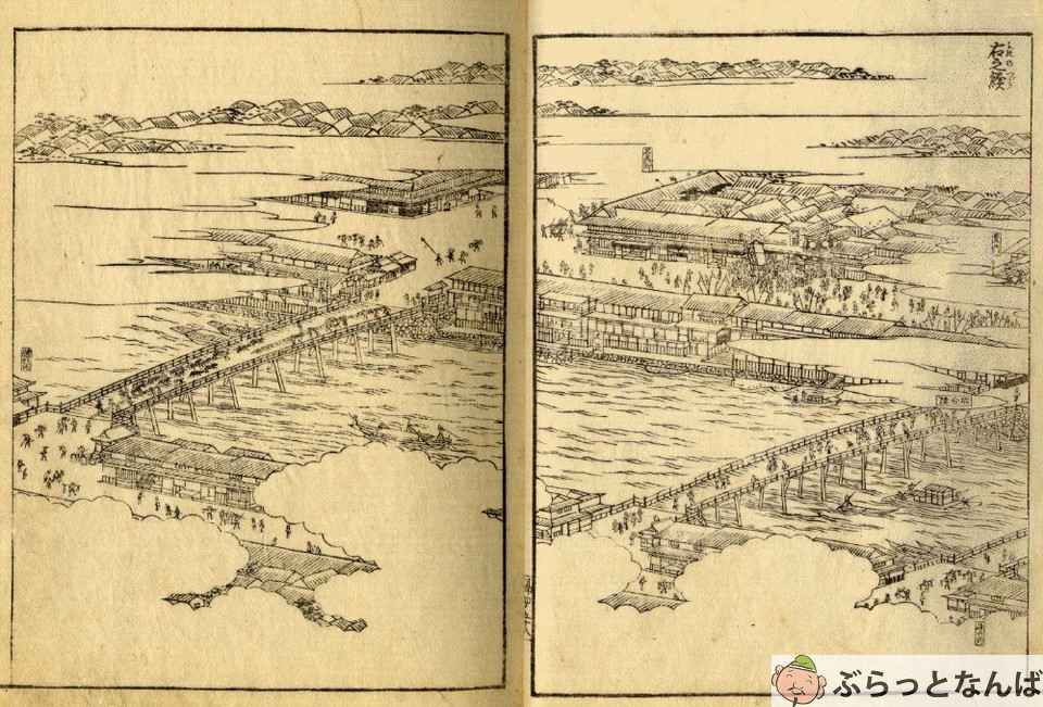 戎橋は、1878(明治11)年に木橋から鉄橋へと架け替えられました。絵図からは橋のたもとにはガス灯も設置されていたことがうかがえ、戎橋が近代都市の景観を備え始めていたことを物語っています。