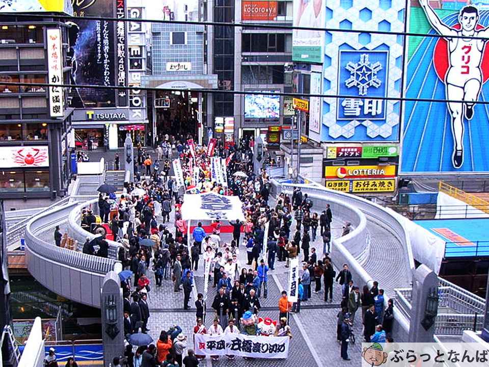 2007(平成19)年11月には、戎橋が現在の丸みを帯びた形に架け替えられ、渡り初め式とパレードが行われました。