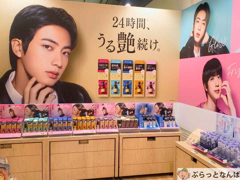 取材時には、BTSのJinさんがCMキャラクターを務めるオイルが購入できるポップアップストアが。大きなパネル写真に思わず見惚れてしまいます。4月24日(金)~5月4日(月)までなので、ファンの方は忘れずにチェックを。