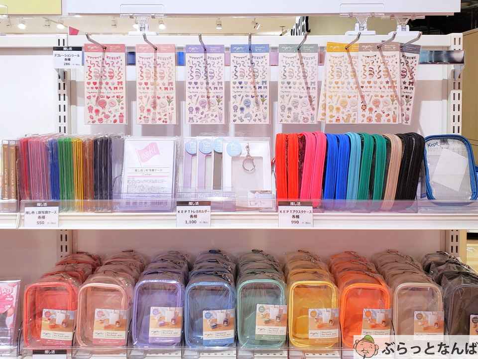 推し活グッズを集めたコーナーでは、アクリルスタンドやぬいぐるみを持ち運ぶためのケースなども販売されています。カラーバリエーションが多いのもありがたいですね。推しカラーもきっと見つかるはず。