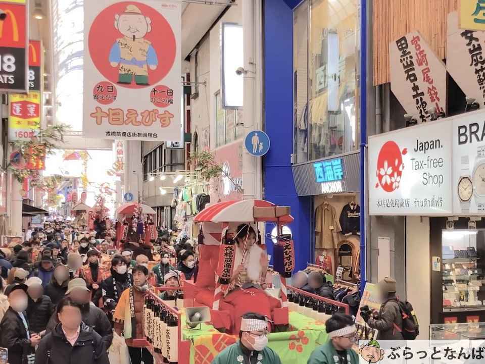 例年1月9日(宵えびす)、10日(本えびす)、11日(残り福)の3日間で100万人以上の参拝者が訪れる、商売繁盛を願う今宮戎神社の十日戎にあわせて行われます。