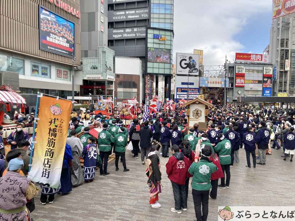 出発式の後、10時20分頃に太左衛門橋(たざえもんばし)北詰の元南地大和屋前(宗右衛門町(そうえもんちょう)のホリディ・イン大阪難波前)から行列がスタートします。