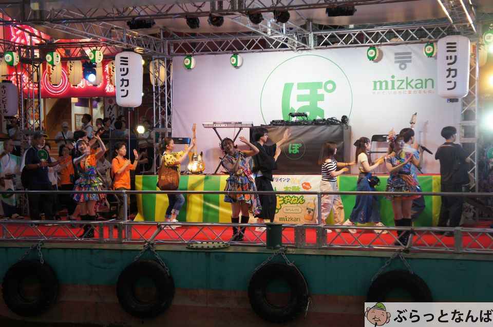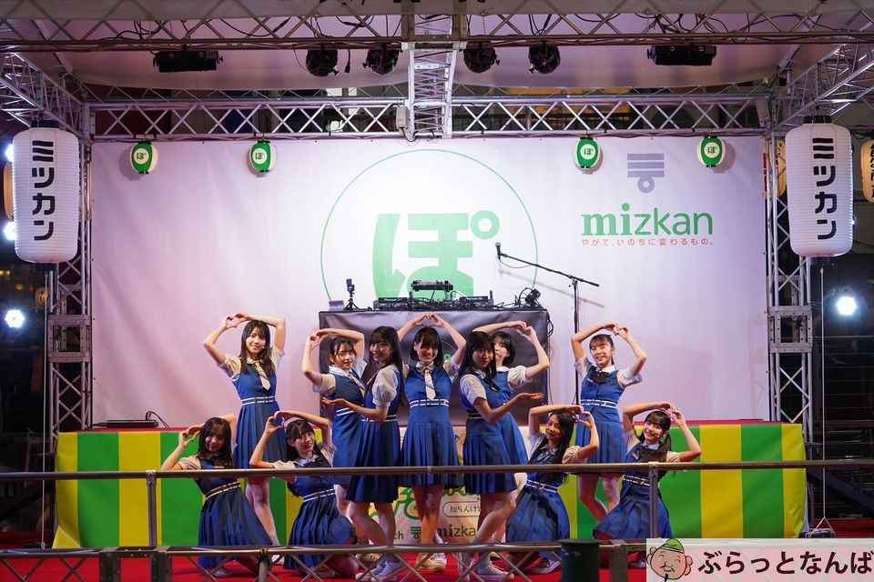 今回のミナミ・フライング万博の⽬⽟企画でもある、白ぽんとも呼ばれる、かんきつ果汁とお酢で作られたミツカンのぽん酢とのスペシャルコラボステージ「ぽん踊り」に、乃⽊坂46の公式ライバルアイドルグループ「僕が⾒たかった⻘空」が登場!青空をイメージさせる制服姿で新曲「スペアのない恋」を含む3曲を披露、彼女たちのライブパフォーマンスで会場は盛り上がりました。