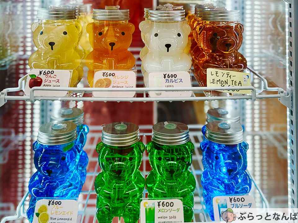 思わず手に取りたくなる、クマの形の透明ボトルに入ったドリンク。見た目の可愛さはもちろん、メロンソーダ、オレンジジュース、ミルクティー、いちごミルクなど味も充実。全16種類の中から、お気に入りを探す楽しさもあります。