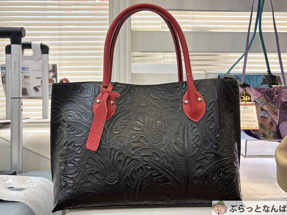本体は黒、持ち手は赤のツートンカラーのバッグ。黒の牛革本体にレザーカービングされた花模様は、シックな中にも華やかさが感じられるデザインです。同窓会などちょっとしたおでかけにもよさそうです。