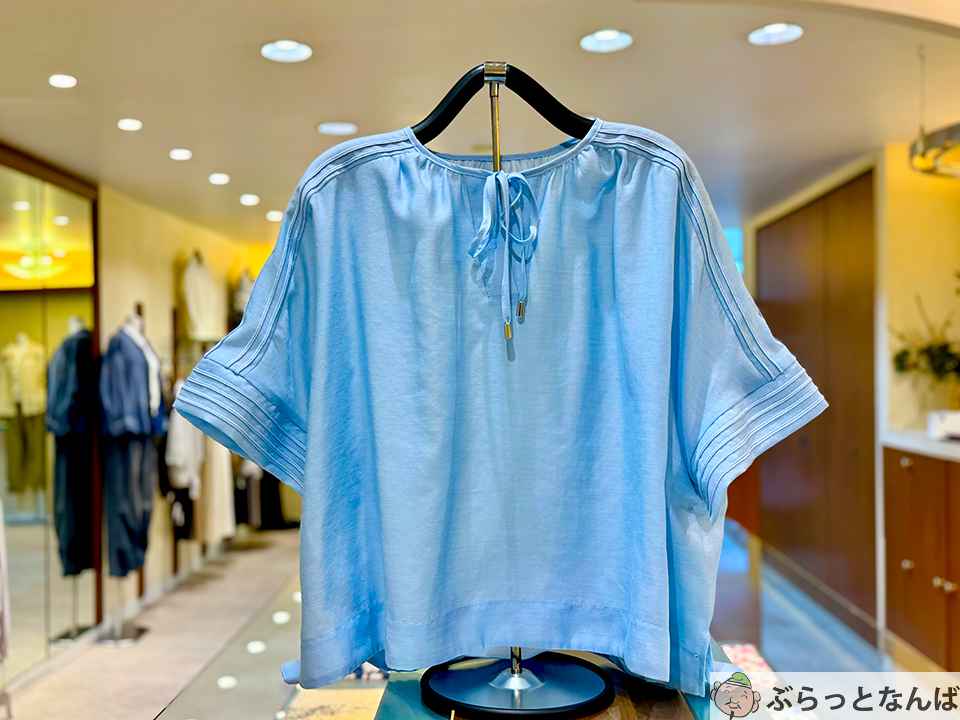 やわらかなブルーが涼しげなブラウスは、これからの季節にぴったり。ゆったりとしたシルエットに、袖のラインや首元のリボンがさりげないアクセントになっています。シンプルながらほどよく華やかさがあり、普段のおでかけにも取り入れやすい一枚です。