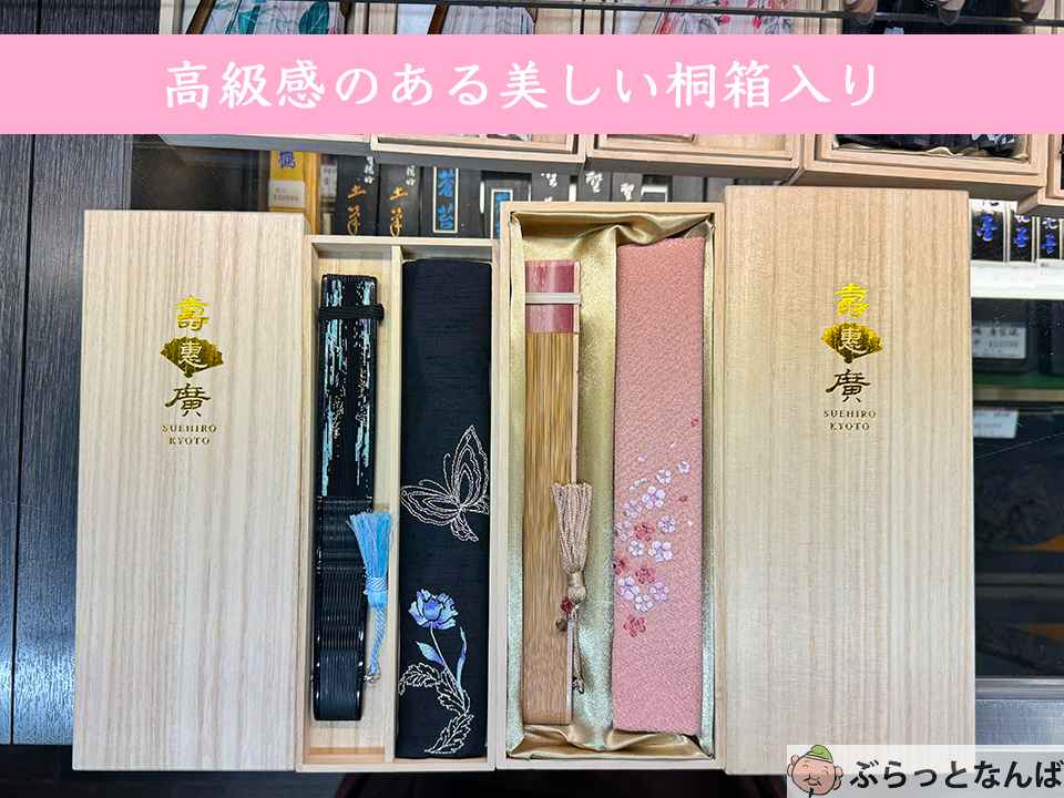 どちらも扇袋付きで、持ち歩きにも便利。桐箱入りで特別感があり、贈り物にもぴったりです。オフシーズンにはそのまま箱に入れて、安心して保管できます。