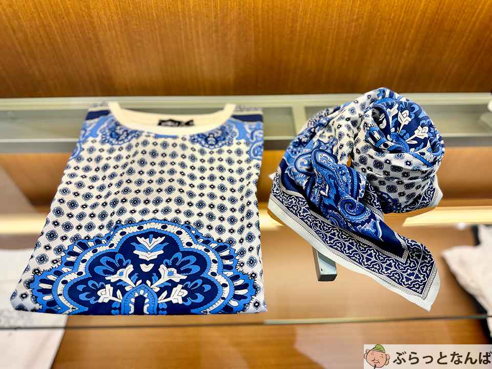 爽やかなブルー系の柄が目を引くTシャツは、顔まわりを明るく見せてくれそうな一枚。幾何学模様とペイズリーを組み合わせたデザインで、どこかオリエンタルな雰囲気を漂わせながらも、都会的ですっきりとした表情に仕上がっています。おそろいのスカーフを合わせれば、コーディネートに統一感が生まれ、上品な華やかさも楽しめます。バッグに忍ばせておけば、気温の変化や冷房対策にも役立ちそうです。