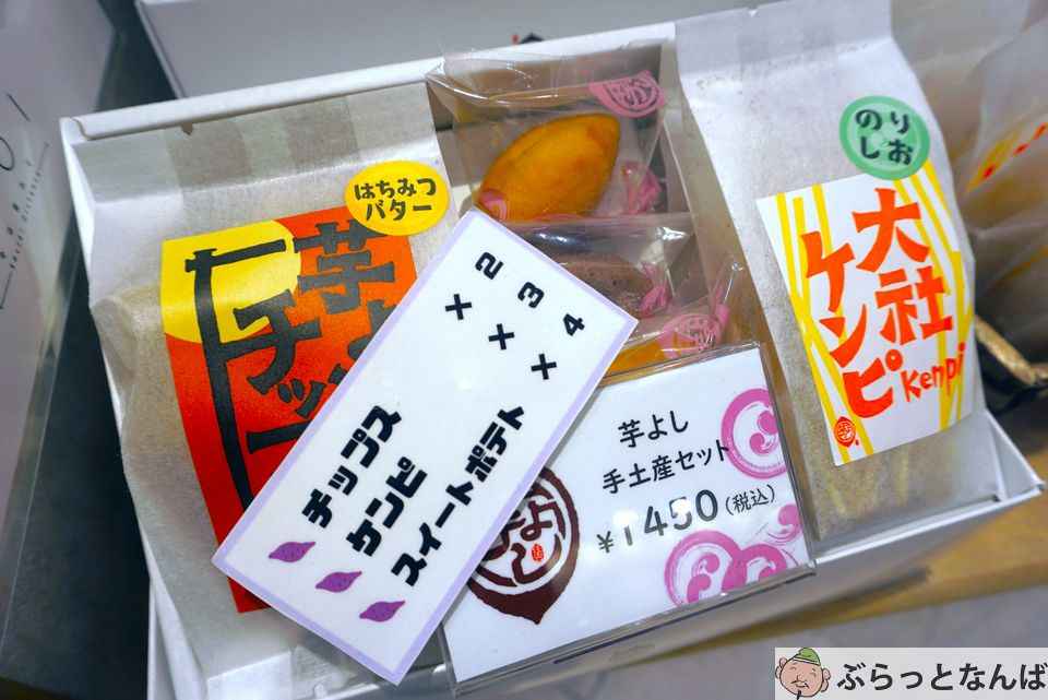 なんばマルイ店限定の「お買い得セット(1070円税込)」もあります。甘党からの支持が厚い生蜜ケン ピ、さつまいもの輪切りの見た目が可愛い芋よしクッキー、 好きな味2種が選べる芋よしチップス が入っています。チップスの一番人気ははちみつバター、スタッフのおすすめはコンソメと のこと。 女性は甘さがおいしいプレーンとはちみつバター、男性はお酒のあてにもなるコンソメと のりしおを買う方が多いそうです。