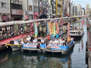 大阪松竹座での「七月大歌舞伎」の前に、歌舞伎俳優たちが道頓堀川に船で乗込み、沿道の歌舞伎ファンにご挨拶するこの行事は、間近で当代きっての歌舞伎俳優たちを見ることができる貴重な機会です。