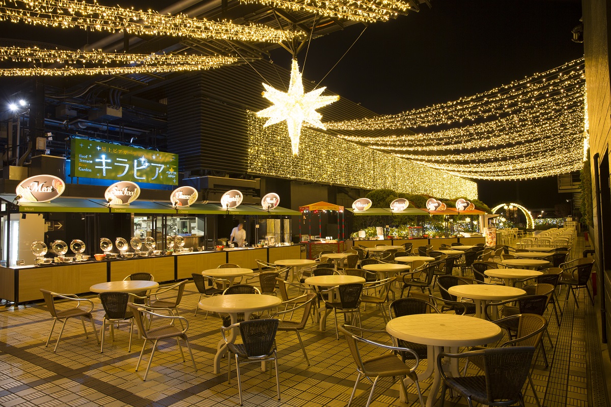 後でご紹介しますが、今年は見どころのひとつであるイルミネーションがリニューアルされ、キラキラおしゃれな雰囲気のなかで美味しくヘルシーなお料理やお酒を楽しむことができます。