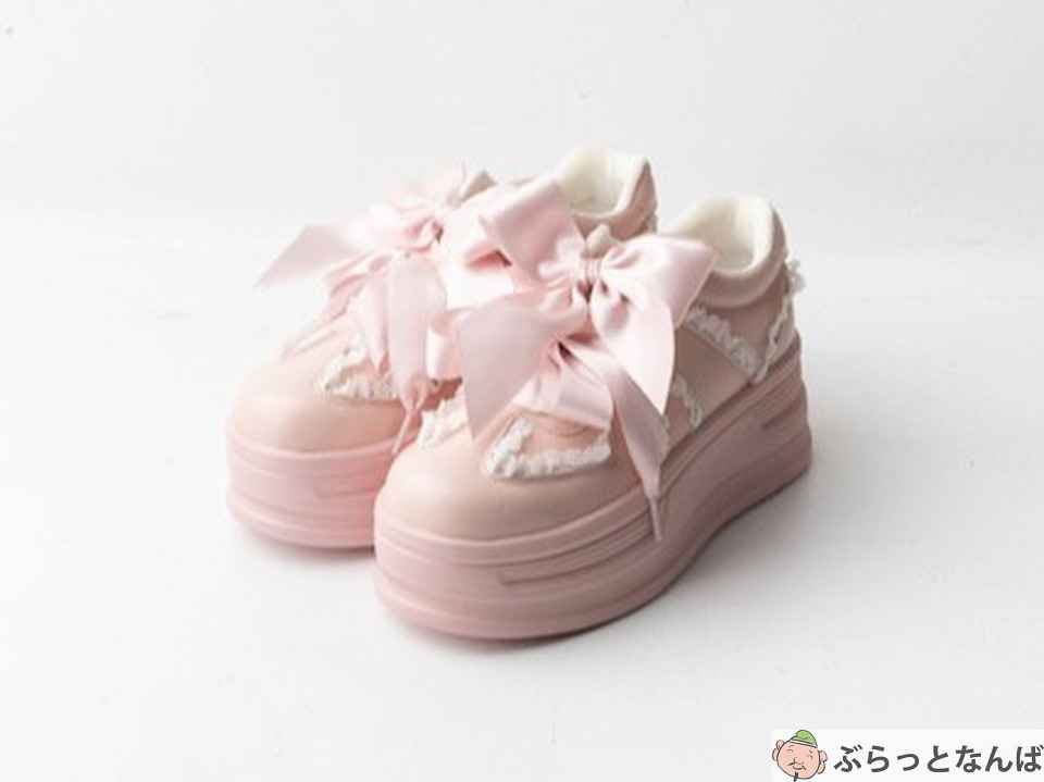 「厚底ダブルリボンフリルスニーカー(145-1676)」は、大きなリボンがガーリーなコーディネートにもぴったり。厚底ですが、傾斜がほとんどなく、歩きやすいので厚底初心者さんでも安全です。履くだけでスタイルアップ効果があるだけでなく、ライブ参戦用のシューズとしてもおすすめです。