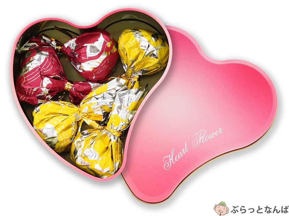 大阪・道頓堀生まれのチョコレートブランド。おすすめの「ハートフラワーリトルカン」は、とにかく見た目も味もかわいいが大渋滞!ピンク色でハート型の缶の中には、赤と黄色の巾着が入っていて、コロンとした形が愛らしいです。