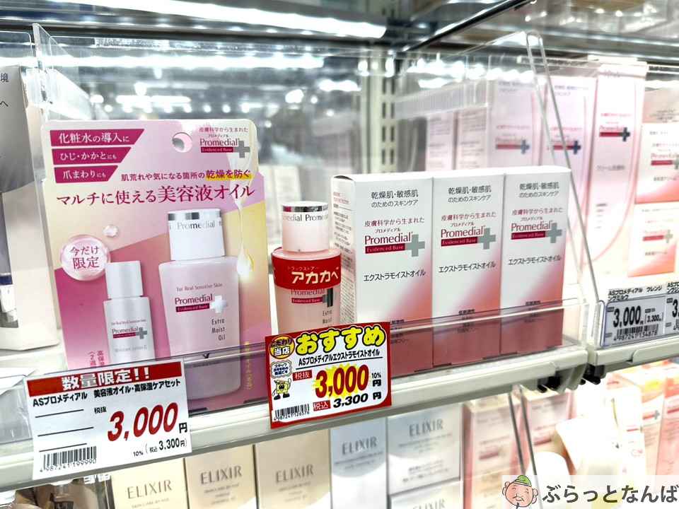 大阪を中心に店舗を展開する、地域密着型ドラッグストアのアカカベ薬局。こちらでは、ピンク色のボトルが上品な「プロメディアル エクストラモイストオイル」を見つけました。