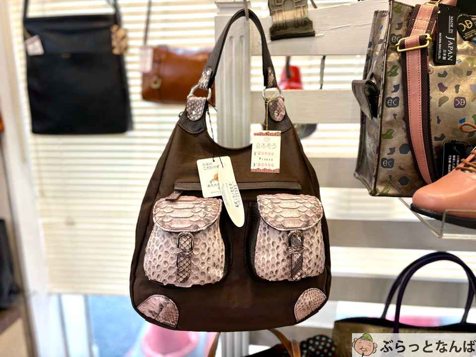 パイソン(ニシキヘビ)レザーの模様が美しい外ポケットがおしゃれなリュックサック。ハンドバッグとしても使用できます。本体はナイロン生地を使用し軽量。人と被らない、高級感と実用性をお求めのおばあちゃんに。