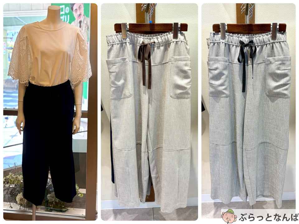 ウエストは総ゴム仕様で着心地ラクラク。くるぶし丈なので、スタイルアップ効果も。カラーはネイビーの他、ライトベージュ、ライトグレーがあります。