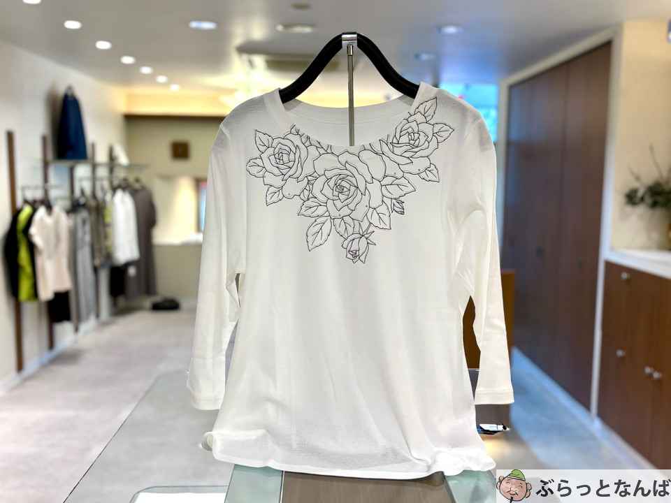 繊細なバラのデザインに、さりげなく輝くラインストーンをあしらった上品なカットソー。綿100%のさらっとした肌触りで、残暑の時期にも快適に着られます。パンツにもスカートにも合わせやすい1着です。