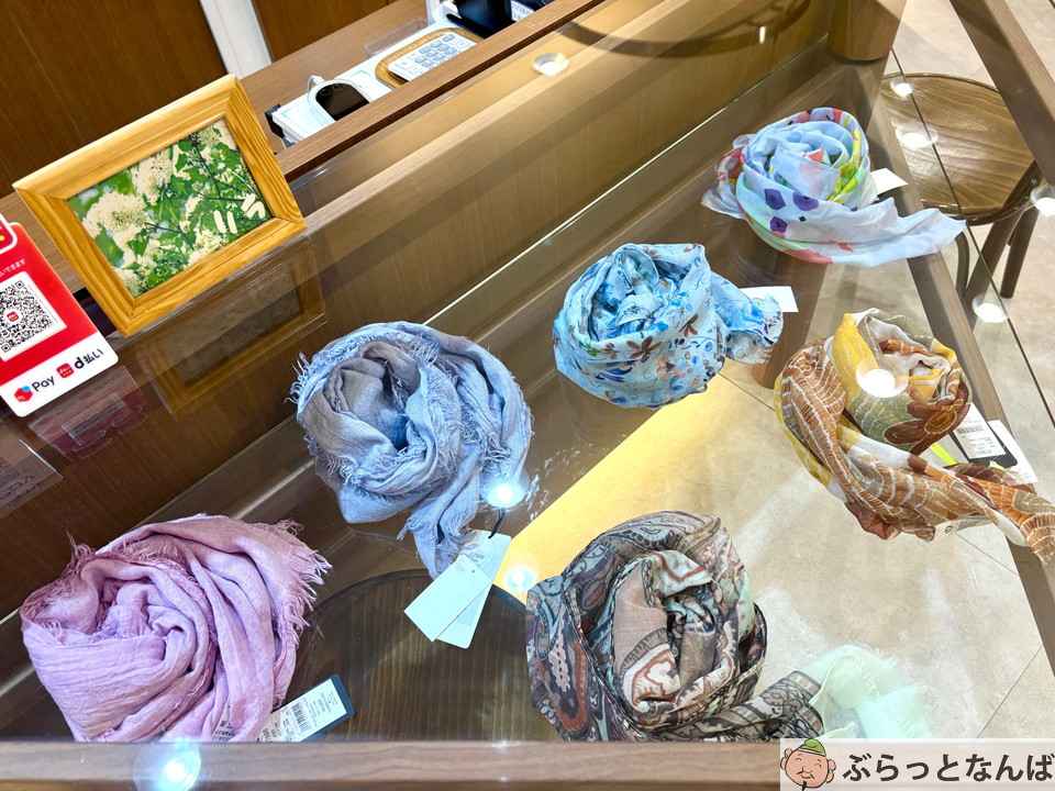 1階のダイコクドラッグ奥にある階段から、2階へお上がりください。店舗はビルの2階にございます。店内には、季節ごとに入荷する素敵な柄のインポートスカーフも取り揃えております。お洋服のアクセントとしてはもちろん、おばあちゃんへの贈り物にもおすすめのアイテムです。