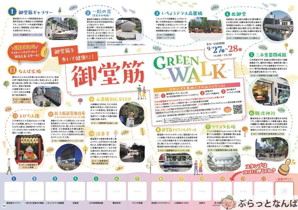 キタからミナミまで御堂筋を歩いて巡るスタンプラリー「御堂筋GREEN WALK」を開催!スタンプを集めると素敵なノベルティがゲットできます。北御堂や旧大阪新歌舞伎座、難波神社など御堂筋界隈のスポット全13カ所を巡るスタンプラリー。ぜひ参加して、御堂筋の魅力を発見してみてください。