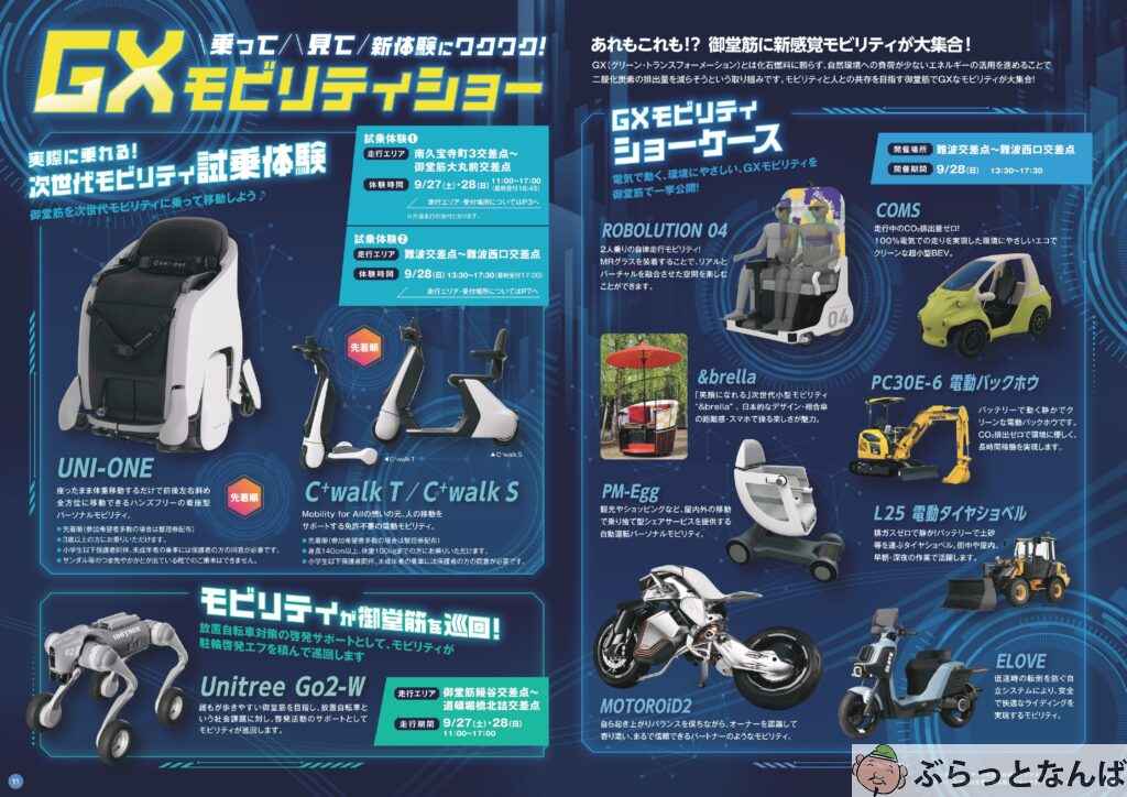 乗って、見て、新体験にワクワクするGXモビリティショーが御堂筋の難波交差点以南(西側)で開催されます。「GX」とは「グリーン・トランスフォーメーション」の略称で、化石燃料への依存から脱却し、太陽光や水素などの自然環境に負荷の少ないクリーンエネルギーを中心とした社会への変革を目指す取り組みです。